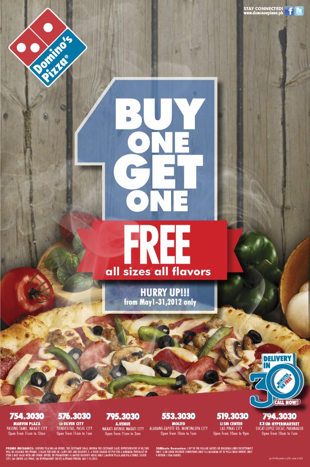 Dominos Buy 1 Get 1 Buy 1 get 1 free pizza on orders at domino's pizza. 1 dominos bogo free pizza promotion: Just use the dominos promo code when you check out. Are you looking for a store that meets all your requirements at good prices?