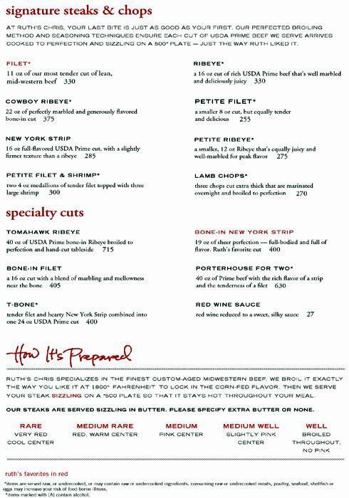 Download Ruth Chris Steakhouse Menu Pics Why ruth's chris is the temple of steak from new york to hong kong…. A listing on allmenus.com does not necessarily reflect our affiliation with or endorsement of the listed. Our perfected broiling method and seasoning techniques ensure each cut of usda prime beef we serve arrives cooked to perfection and sizzling on a 500° plate—just the way ruth liked it. Ruth's chris will bring its exquisite fare and exclusive dining experiences towards the columbus area in its new 8,759 square foot restaurant. So we thought we'd try ruth chris steakhouse. Seared to perfection at 1800 degrees.