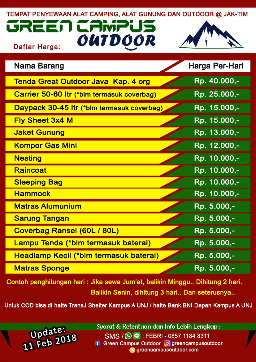 Sewa Tenda Camping Jakarta Wild.adventure menyewakan berbagai macam peralatan perlengkapan camping atau kemah dengan harga yang murah dan harga terjangkau bagi. Hubungi untuk melihat harga dan stock whatsapp : Ngeson sedia tenda dome, tenda camping, sleeping bag, persewaaan alat camping & outdoor jogja. Djamilah tenda merupakan group dari h.