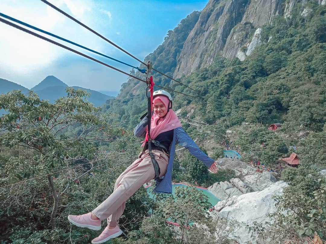 Wahana flying fox pakuhaji bandung barat sebelum pandemi covid.